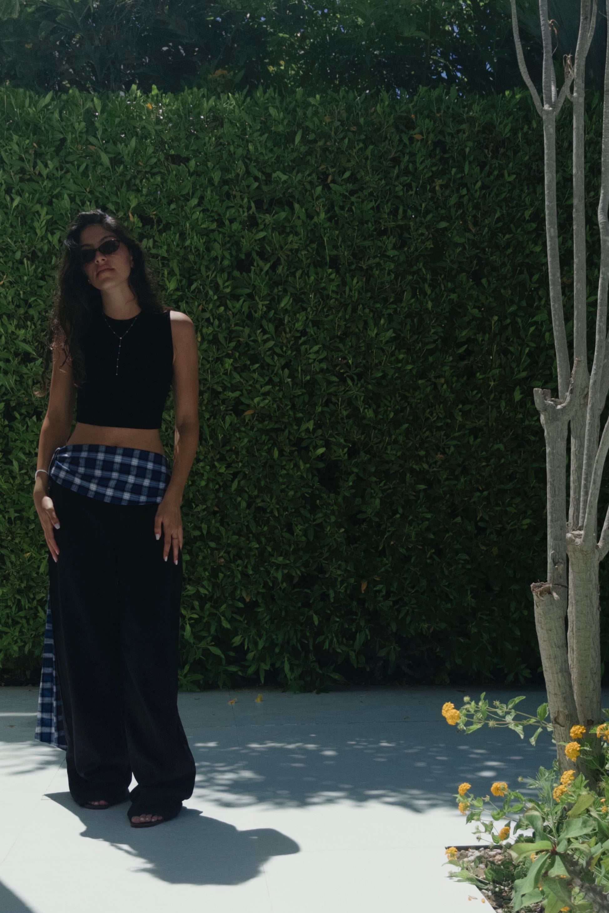 Tailored mid-rise trousers with a contrasting checkered waist drape detail. Crafted from structured cotton-twill with clean lines and a full-length cut. Features a fitted waistband, subtle side zip, and sculpting darts for a flattering, elongated silhouette.
