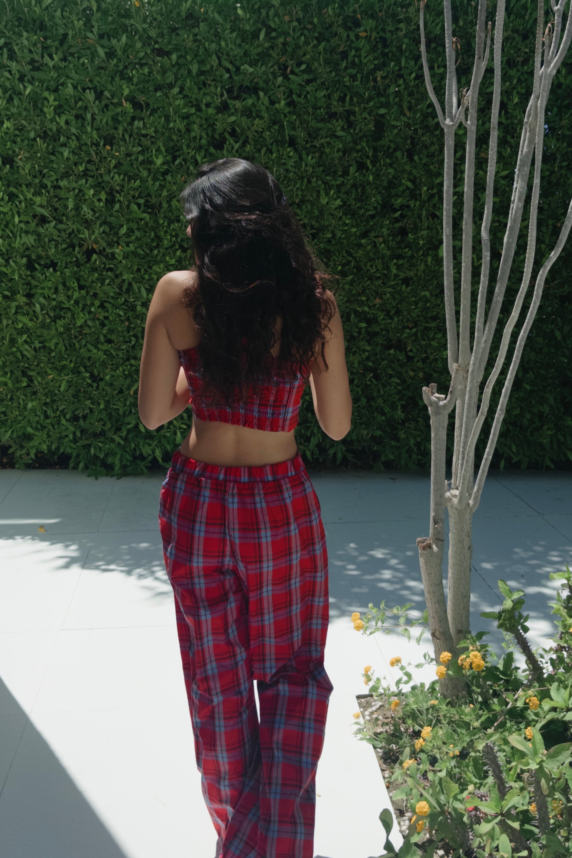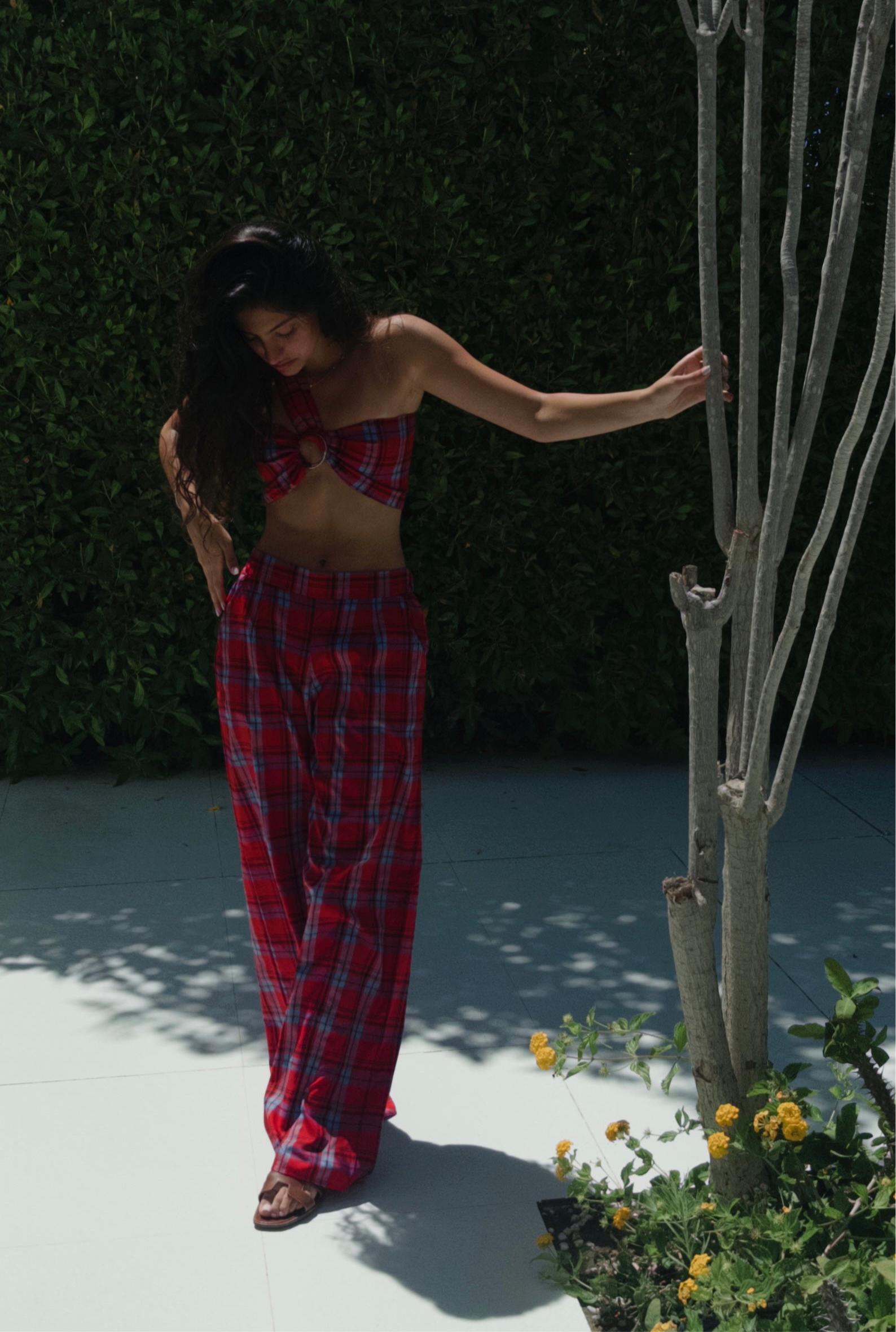 Nostalgic plaid two-piece in brushed cotton flannel with a soft touch. Bandeau-style top with a elastic back, paired with mid-waisted, straight-leg trousers. Designed for comfort and attitude—playful, polished, and unapologetically 2000s.