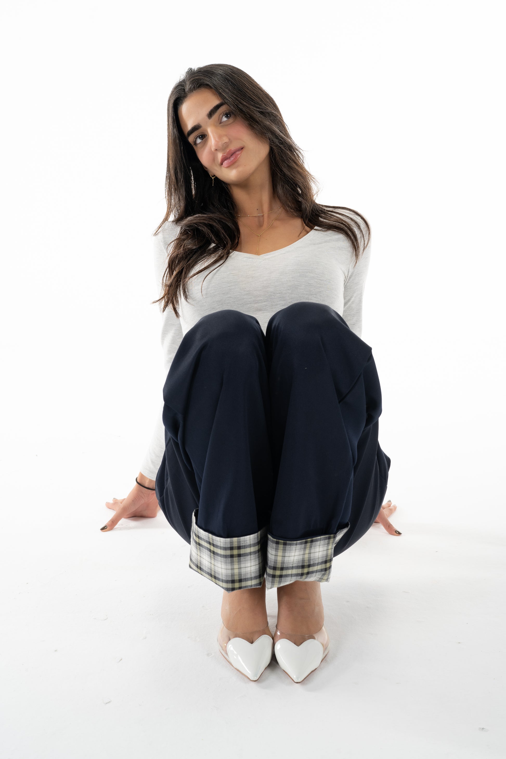 Navy straight-leg trousers featuring wide plaid cuffs for a playful contrast. Style with a basic top for an easy, casual look.