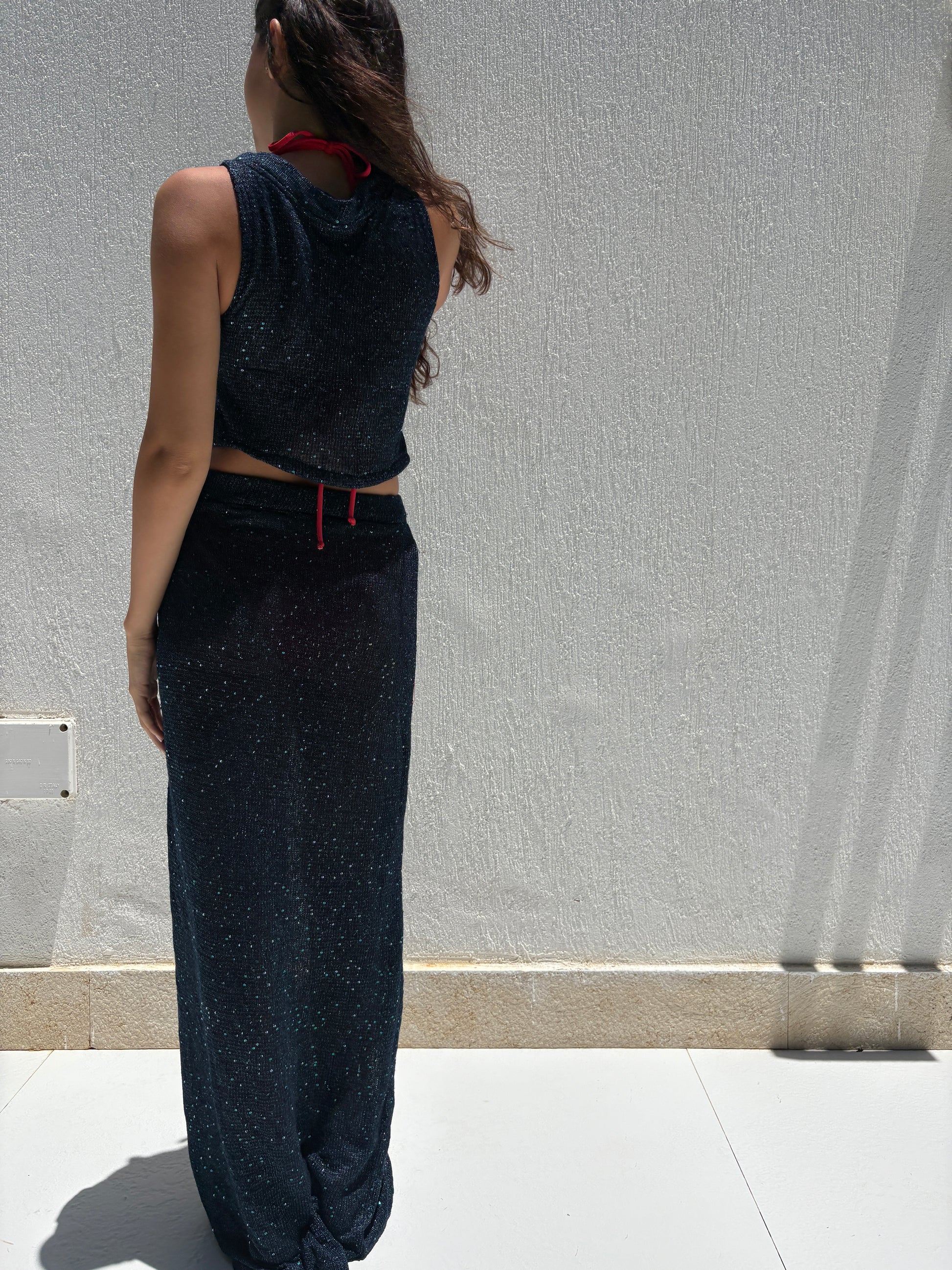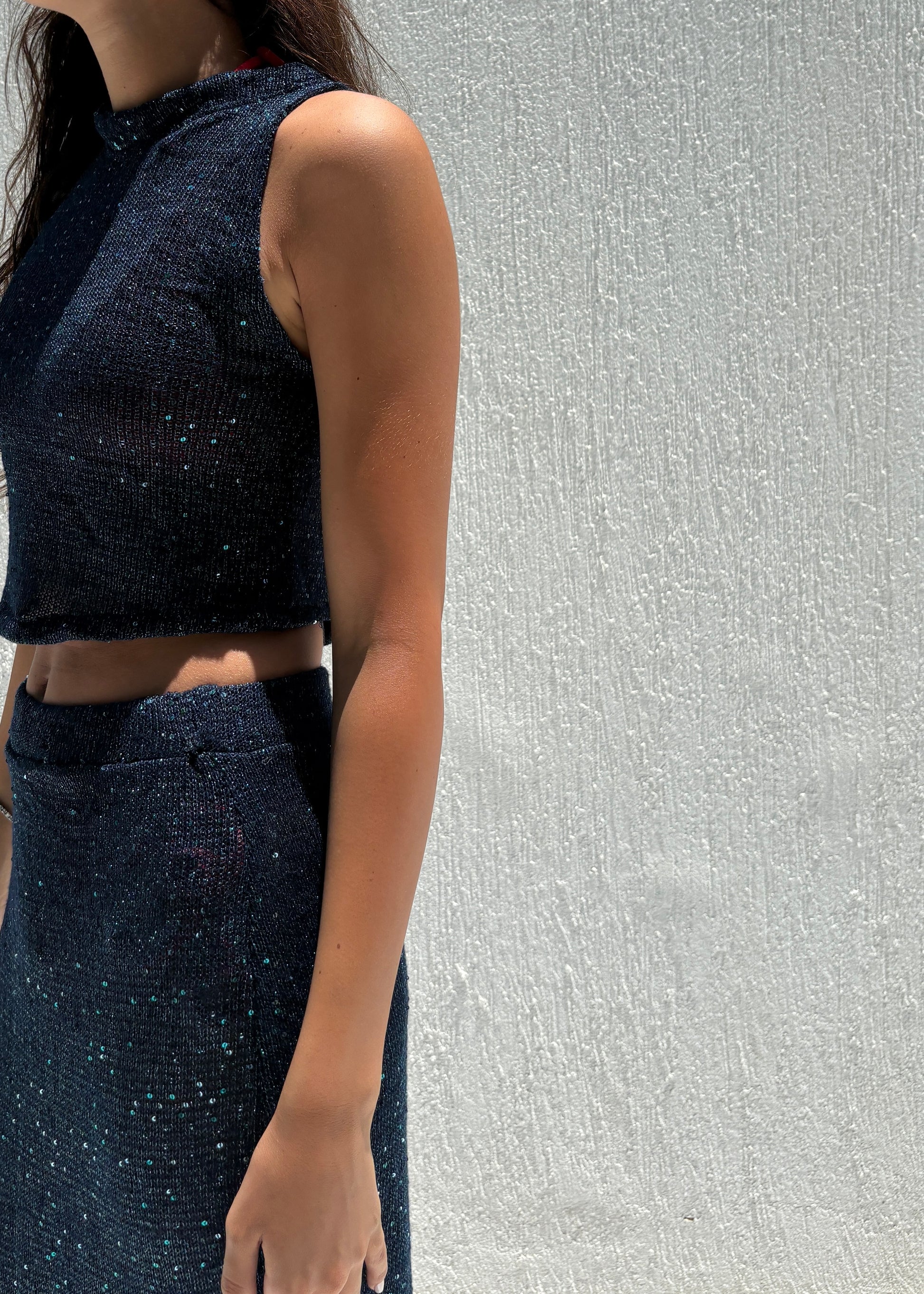 This two-piece midnight navy set features a stretch-knit sleeveless crop top and matching midi skirt, both woven with micro-sequins for a subtle shimmer. Designed for a sleek fit with a soft, comfortable lining—effortlessly transitioning from day glow to evening glow.