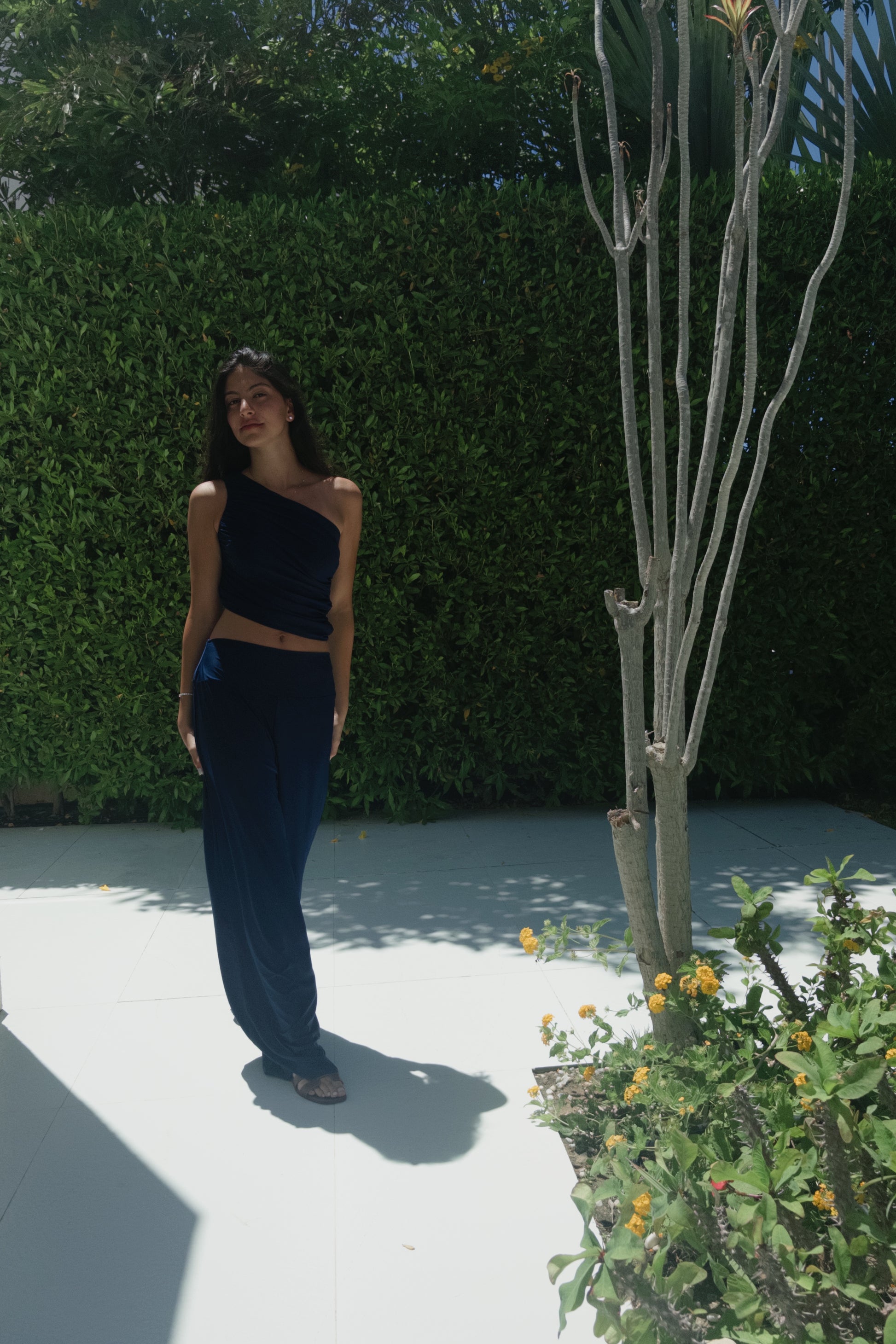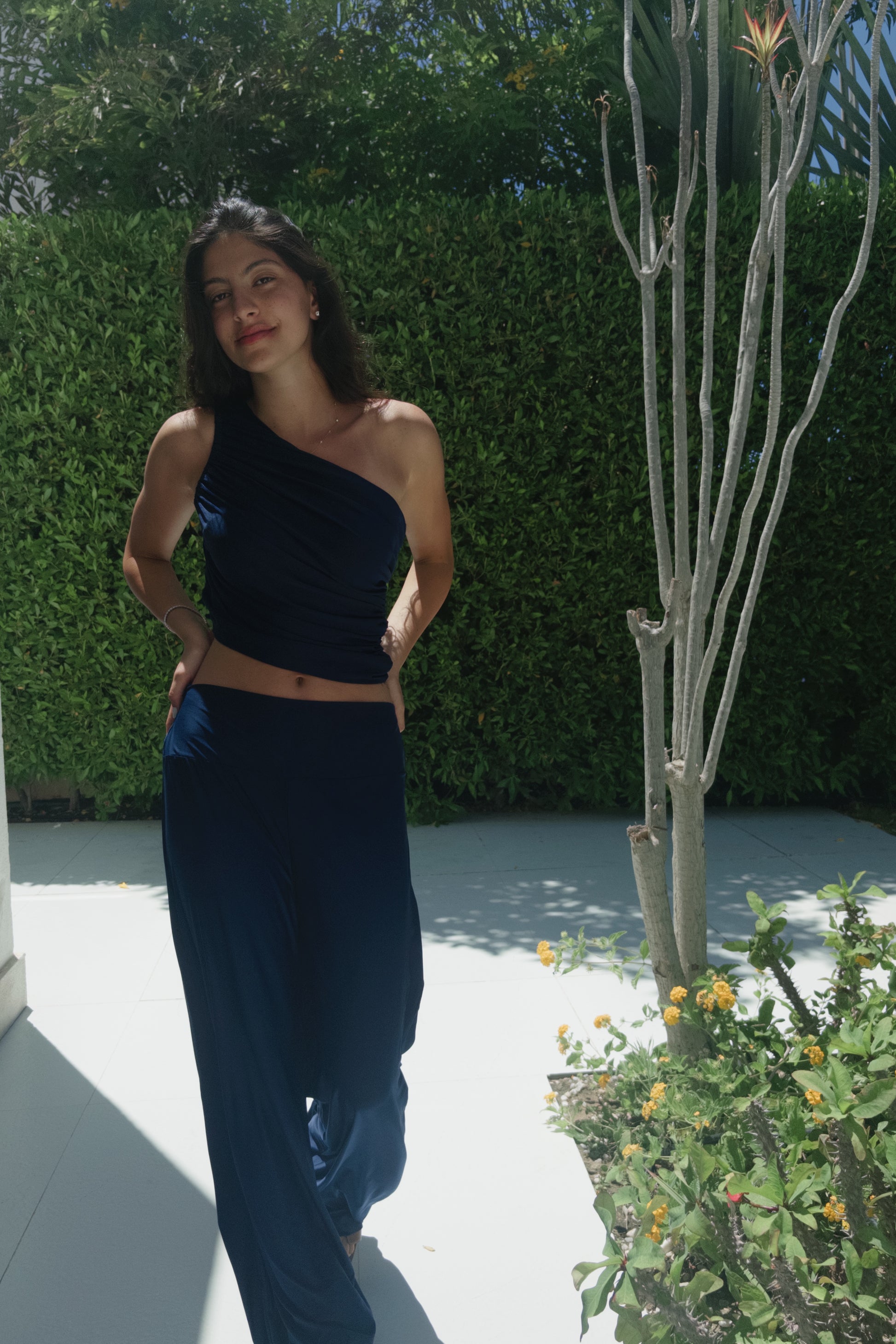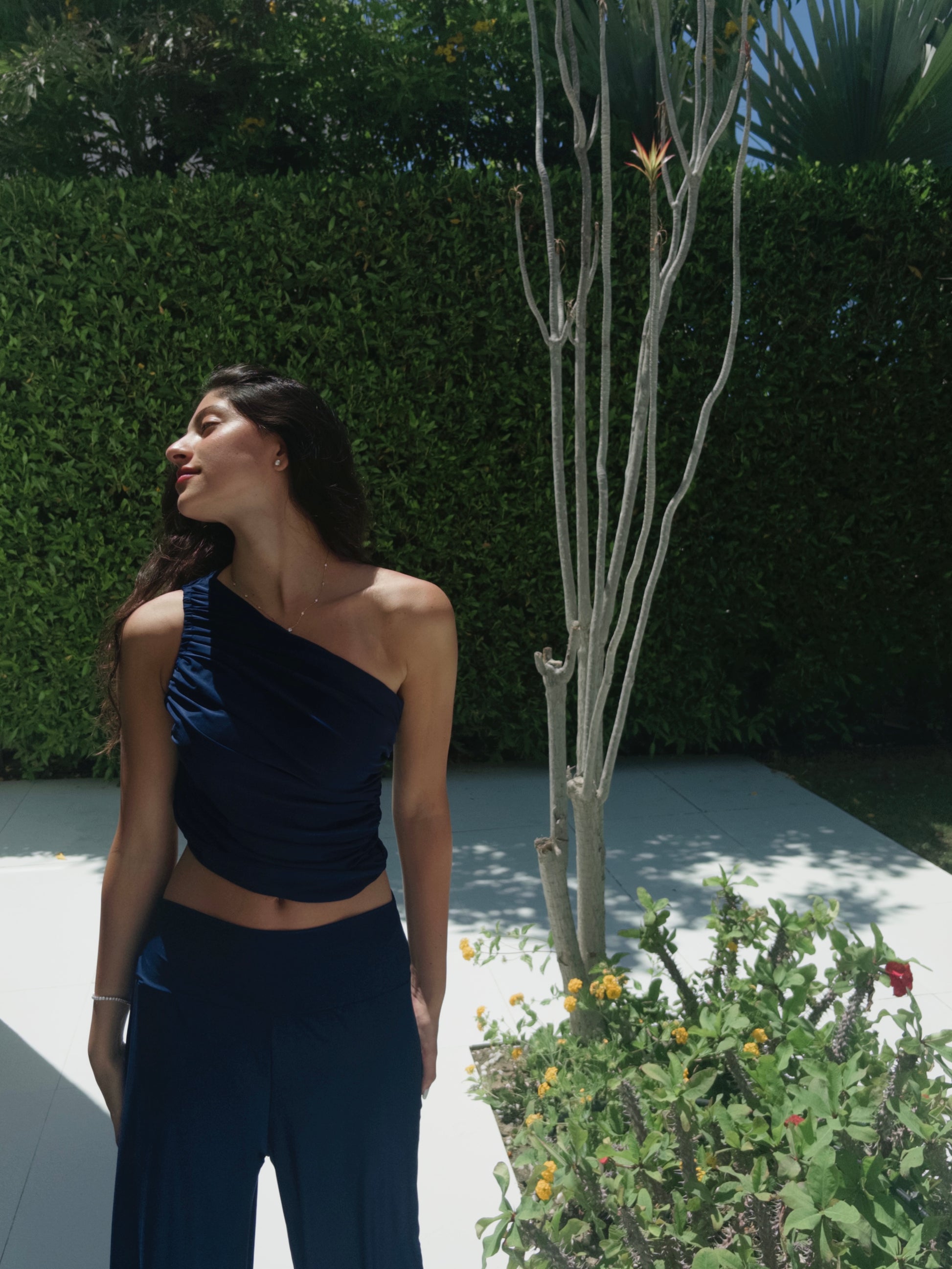 A soft asymmetrical bandeau top paired with relaxed pants—cut from lightweight, stretch-blend cotton jersey. The set contours naturally to the body with elegant drape and fluid motion, offering elevated comfort from day to dusk.