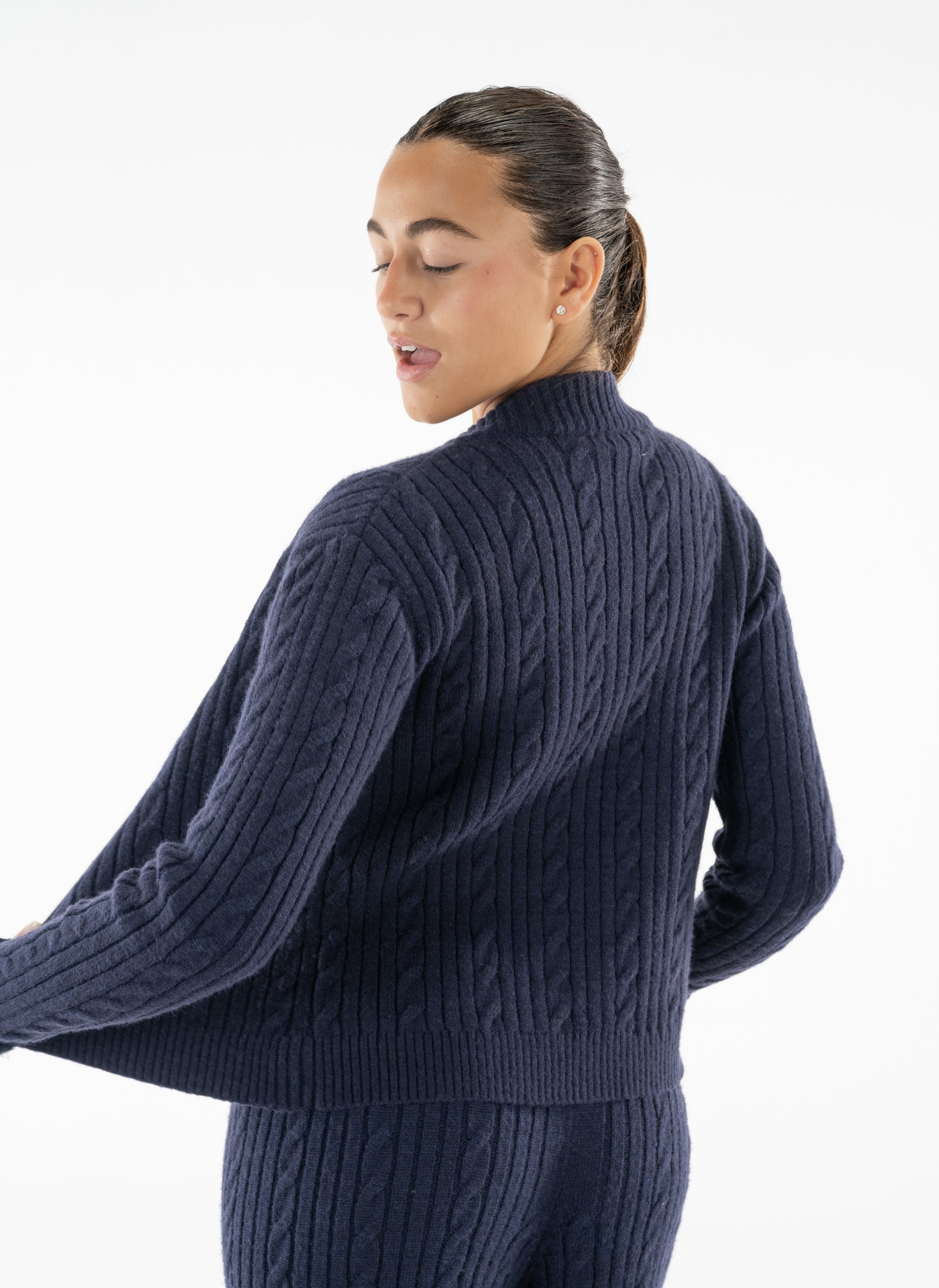 A cozy navy cable-knit set with a relaxed zip-up jacket and matching wide-leg pants. Soft, comfy, and easy to throw on over any top.