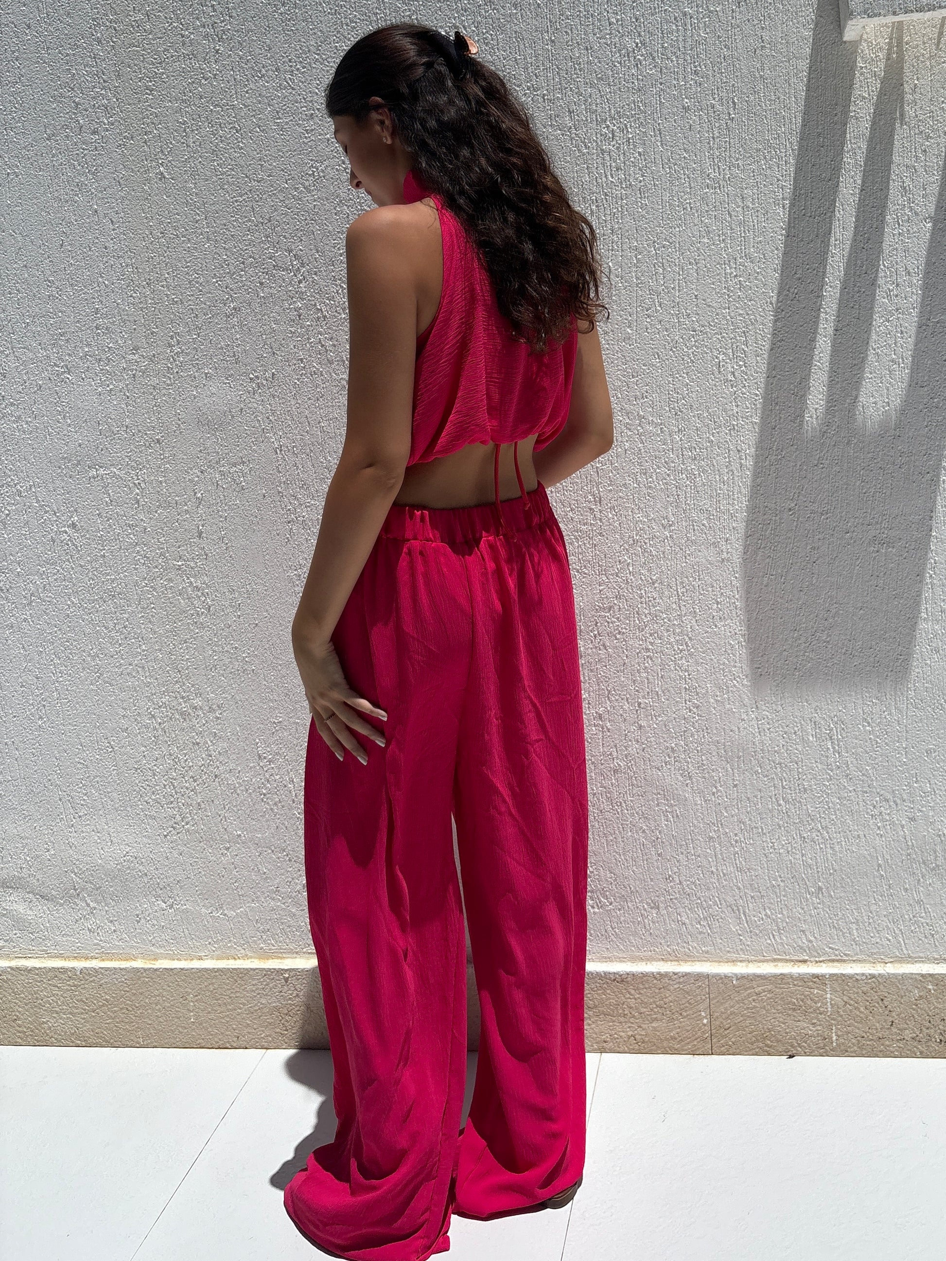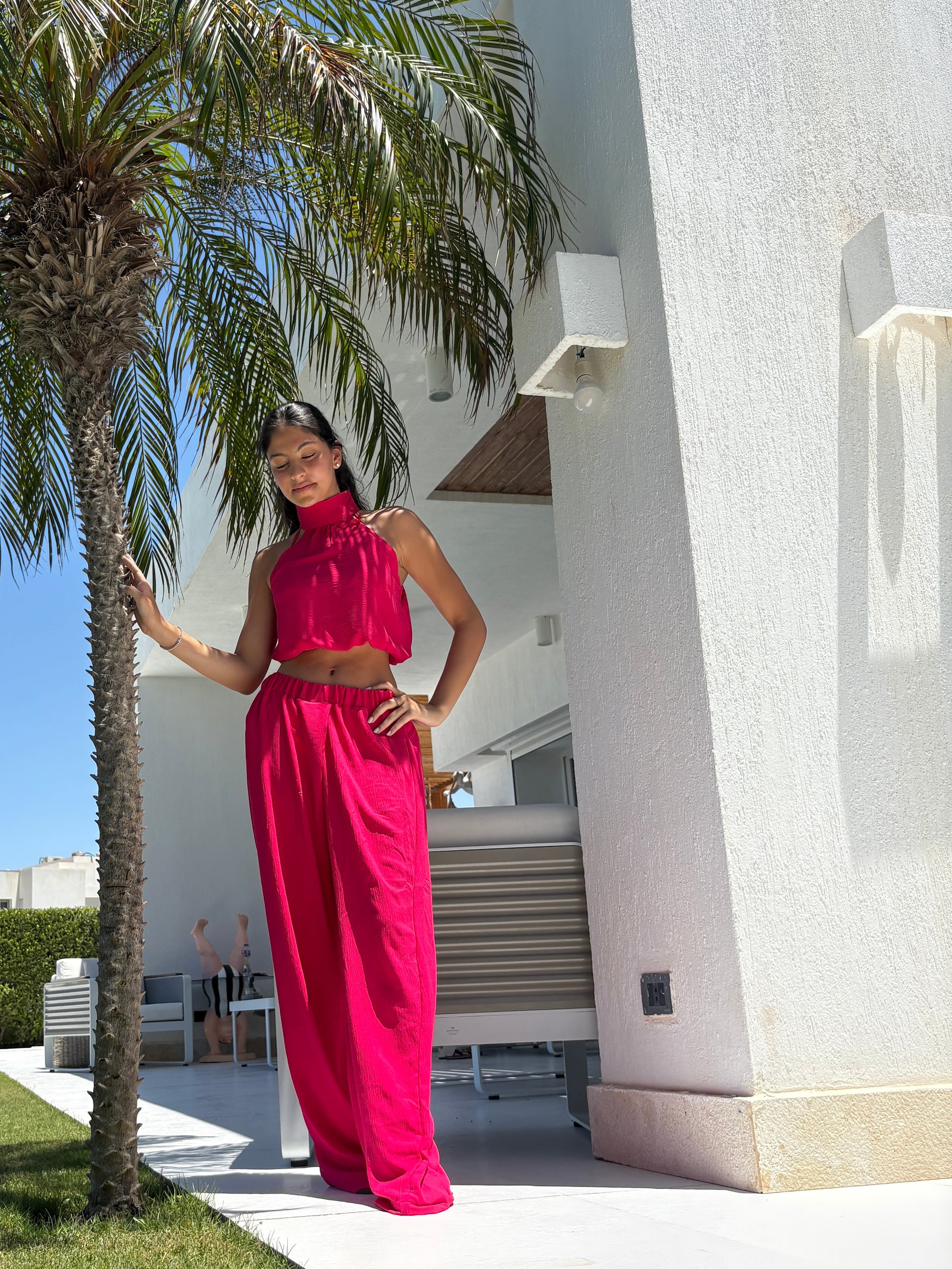 A vibrant co-ord in lightweight cotton with a soft drape. The gathered halter top features an adjustable button neck and elastic hem. Paired with wide-leg high-rise trousers with a relaxed, full length silhouette. Effortless, fun, and bold in attitude.